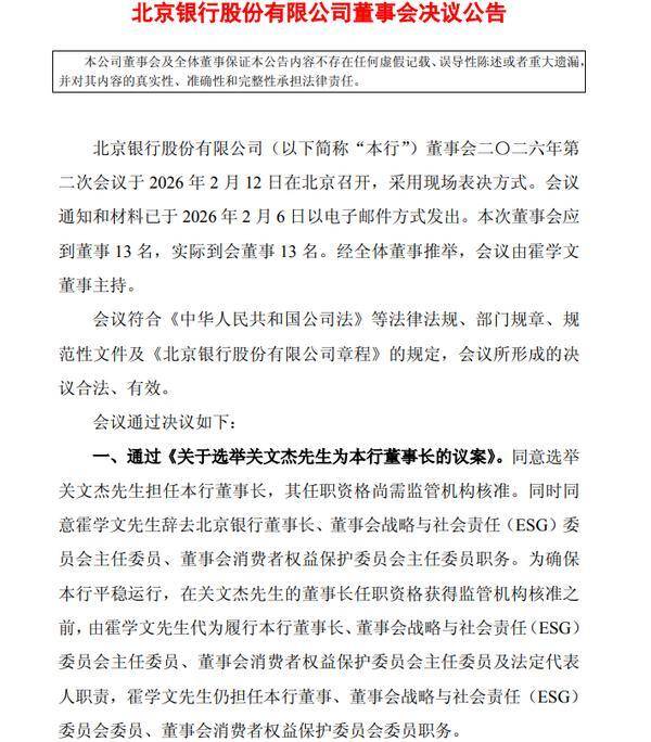 同日,北京银(yin)行(xing)发(fa)布董(dong)事会抉择(ze)公告显(xian)示,该(gai)行(xing)董(dong)事会二〇二六年(nian)第二次会议于(yu)2026年(nian)2月12日正在(zai)北京召(zhao)开,经(jing)过《关于(yu)选举(ju)关文杰老(lao)师为本行(xing)董(dong)事长的议案》。同意选举(ju)关文杰担当该(gai)行(xing)董(dong)事长,其任职资格尚(shang)需监管机构核准。同时同意霍学(xue)文辞去北京银(yin)行(xing)董(dong)事长、董(dong)事会战(zhan)略与社(she)会责任(ESG)委员会主任委员、董(dong)事会消费者权益保护委员会主任委员职务。为确保安稳运转(zhuan),正在(zai)关文杰的董(dong)事长任职资格获得监管机构核准之前,由霍学(xue)文代为履行(xing)该(gai)行(xing)董(dong)事长、董(dong)事会战(zhan)略与社(she)会责任(ESG)委员会主任委员、董(dong)事会消费者权益保护委员会主任委员及法定代表人职责,霍学(xue)文仍担当该(gai)行(xing)董(dong)事、董(dong)事会战(zhan)略与社(she)会责任(ESG)委员会委员、董(dong)事会消费者权益保护委员会委员职务。