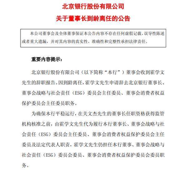 中国网财经(jing)2月13日讯 昨日,北京银(yin)行(xing)发(fa)布公告。董(dong)事会收到霍学(xue)文的辞职报告。因到龄离任,霍学(xue)文申请辞去北京银(yin)行(xing)董(dong)事长、董(dong)事会战(zhan)略与社(she)会责任(ESG)委员会主任委员、董(dong)事会消费者权益保护委员会主任委员职务。