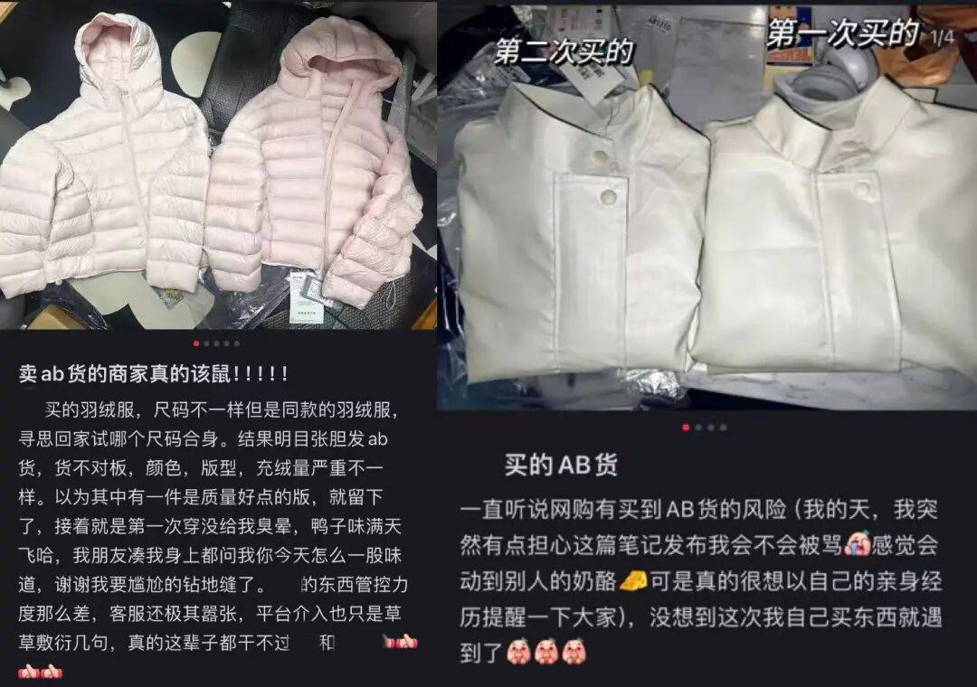 “卖AB货的商家真的该骂!”一(yi)位(wei)江西的消费者在(zai)社交平台(tai)发布帖子吐槽道,她晒出两件同(tong)款羽绒服——同(tong)一(yi)家店(dian)铺购买,只(zhi)是尺码不同(tong)。原本只(zhi)是想回家试(shi)穿后留下更合(he)适的一(yi)件,但当两件衣服摆在(zai)一(yi)起时,她发现颜色、版(ban)型甚至充绒量(liang)都有(you)明显差别。