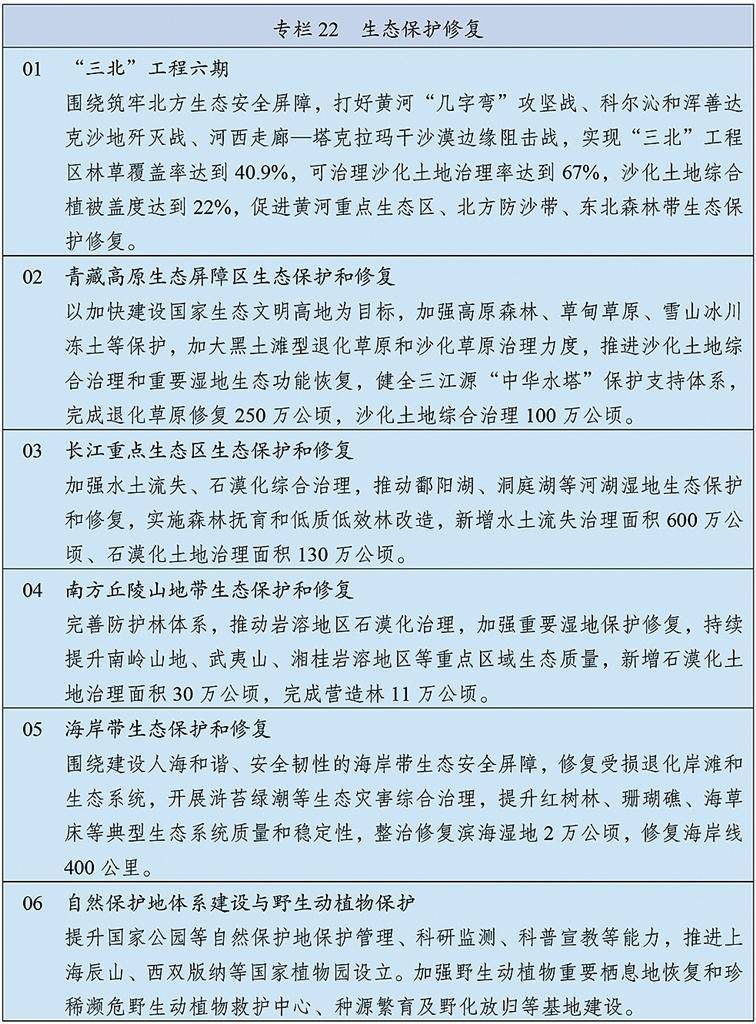 统筹推进紧张生(sheng)态(tai)系统保护和修复重(zhong)大工程,持续(xu)巩固以“三(san)区四带”为骨架的国家生(sheng)态(tai)安全屏蔽体系。打(da)好(hao)“三(san)北”工程攻坚战,推动(dong)三(san)大标志(zhi)性战役取得决定性胜利。深入推进青(qing)藏高原生(sheng)态(tai)保护,增强重(zhong)点区域水土流失管理和石漠化(hua)管理。迷信展开大规(gui)模国土绿化(hua)行动(dong),推进森林质量(liang)精准提拔和国家储备林建(jian)设,森林蓄积量(liang)达到224亿立(li)方米,统筹草原生(sheng)态(tai)修复与公道利用,增强湿地保护修复。推进超引地表(biao)水和超采(cai)地下水管理,展开汗青(qing)遗留废弃矿山生(sheng)态(tai)修复。