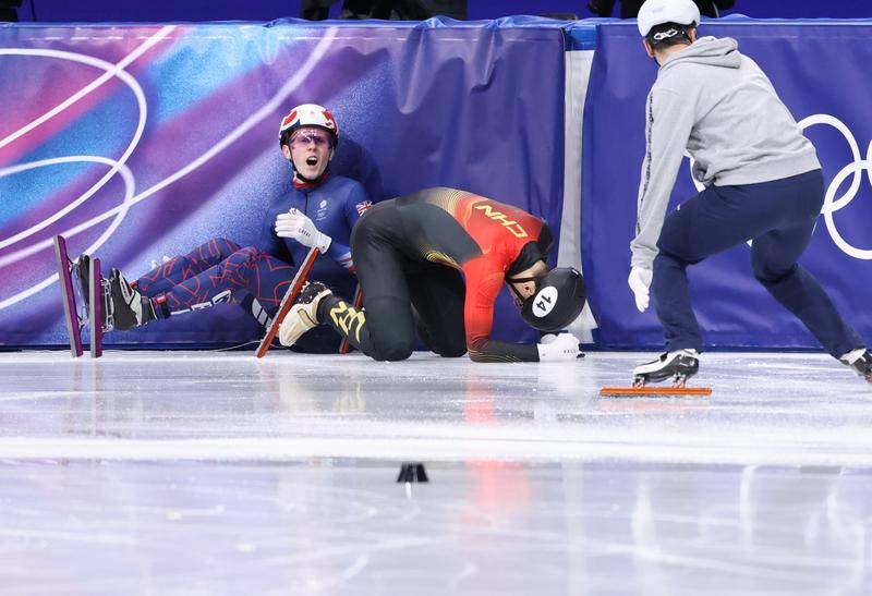 2月14日(ri),我国(guo)选手刘少昂(ang)(中(zhong))正在比赛(sai)中(zhong)被跌倒的英国(guo)选手特雷西(左)带出赛(sai)道。新华社记者 陈益宸 摄
