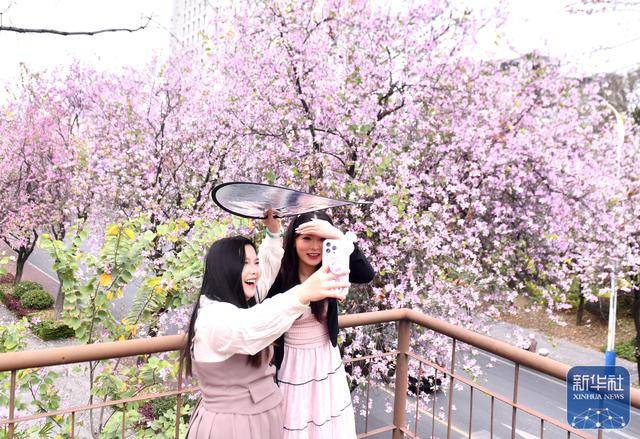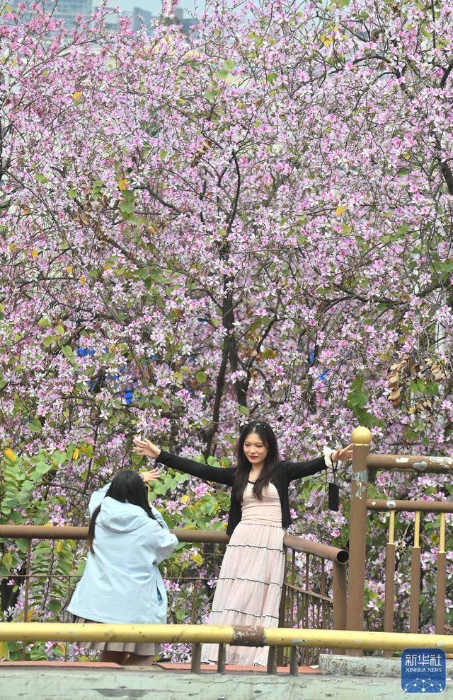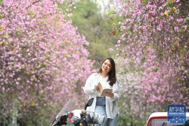 ↑ 3月18日,游客在柳州市水南路赏(shang)花(hua)。新华社记者 黄(huang)孝邦 摄
