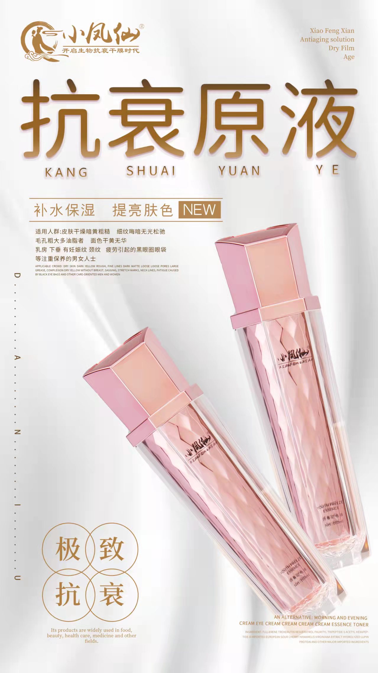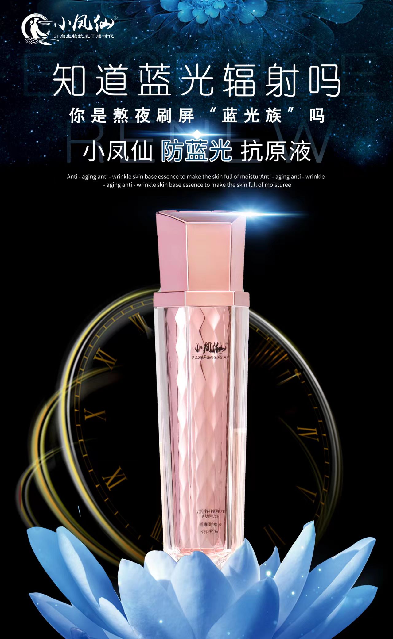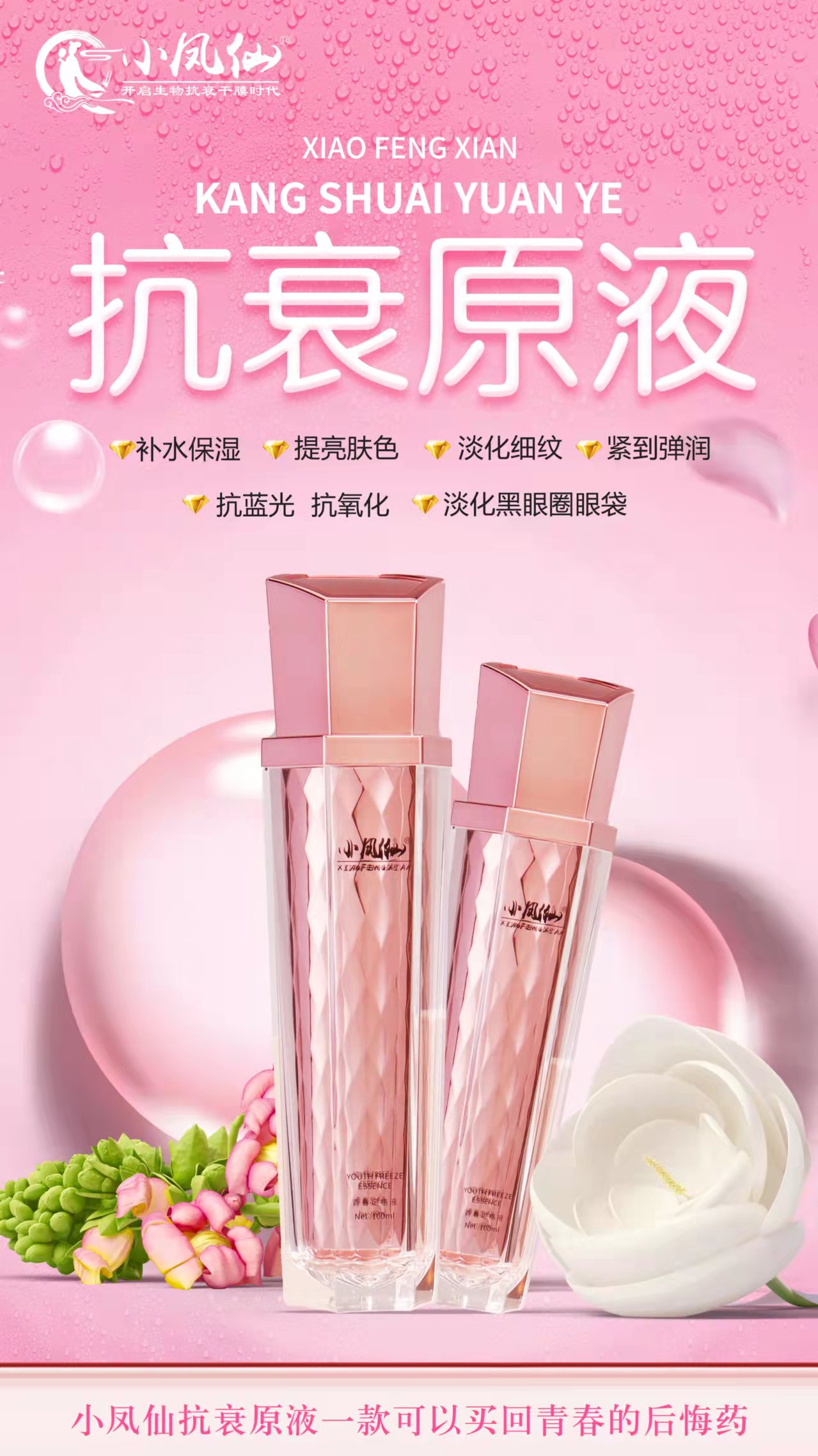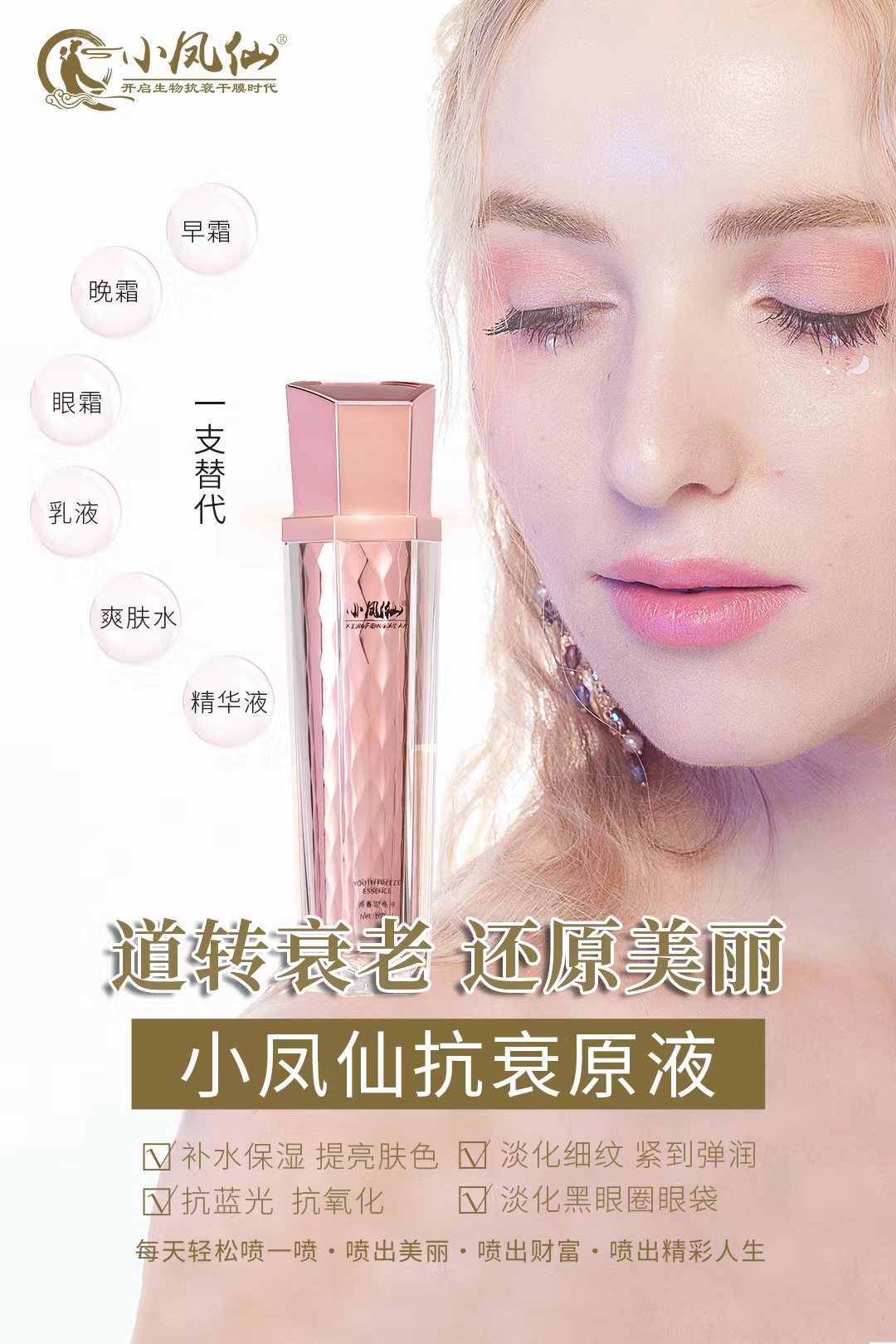 小凤仙抗衰原液,它是一款替代日常保养护肤用的早霜,晚霜,眼霜,精华液,爽肤水,乳液等,每天轻松喷一喷,补水亮肤,提升紧致,淡化细纹,淡化黑眼圈,抗蓝光,抗氧化等。