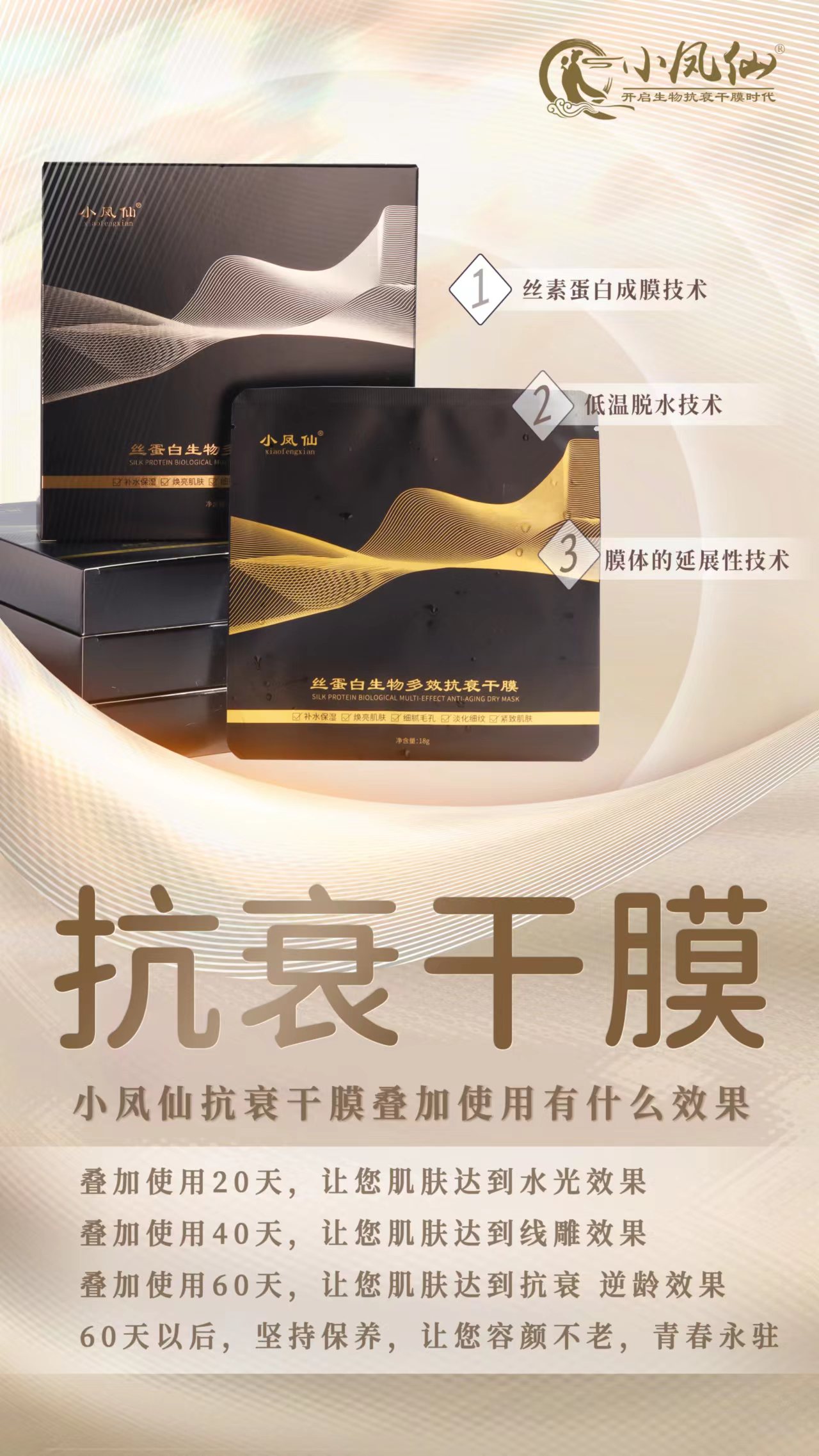 小凤仙抗衰干膜,它是一款颠覆传统面膜的抗衰干膜,是面膜的一次升级,一次革命,每天轻松贴一贴,叠加使用20-40天,肌肤达到水光效果,肌肤提亮12个度,叠加使用60-80天,肌肤达到线雕效果,提升紧致,叠加使用3个月以后,肌肤看起来年轻3-10岁。